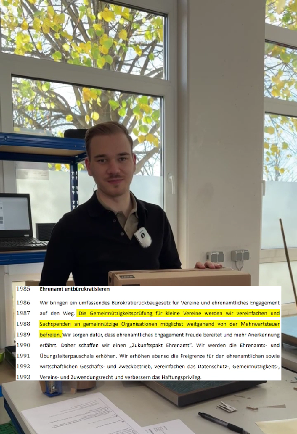 8. Der aktuelle Koalitionsvertrag greift das Thema im Kapitel „Ehrenamt entbürokratisieren“ auf: „Wir bringen ein umfassendes Bürokratierückbaugesetz für Vereine und ehrenamtliches Engagement auf den Weg. Die Gemeinnützigkeitsprüfung für kleine Vereine werden wir vereinfachen und Sachspenden an gemeinnützige Organisationen möglichst weitgehend von der Mehrwertsteuer befreien. (Zeilen 1985 bis 1989 KoaV).